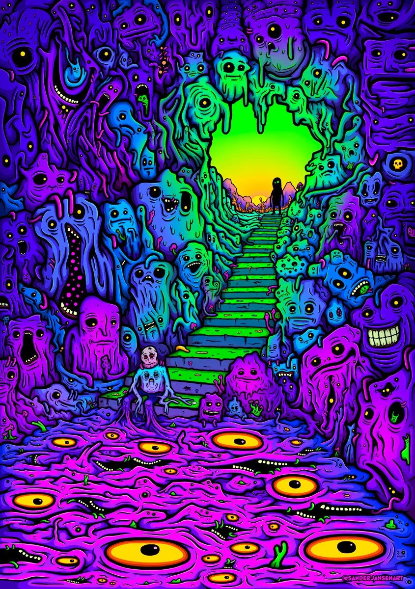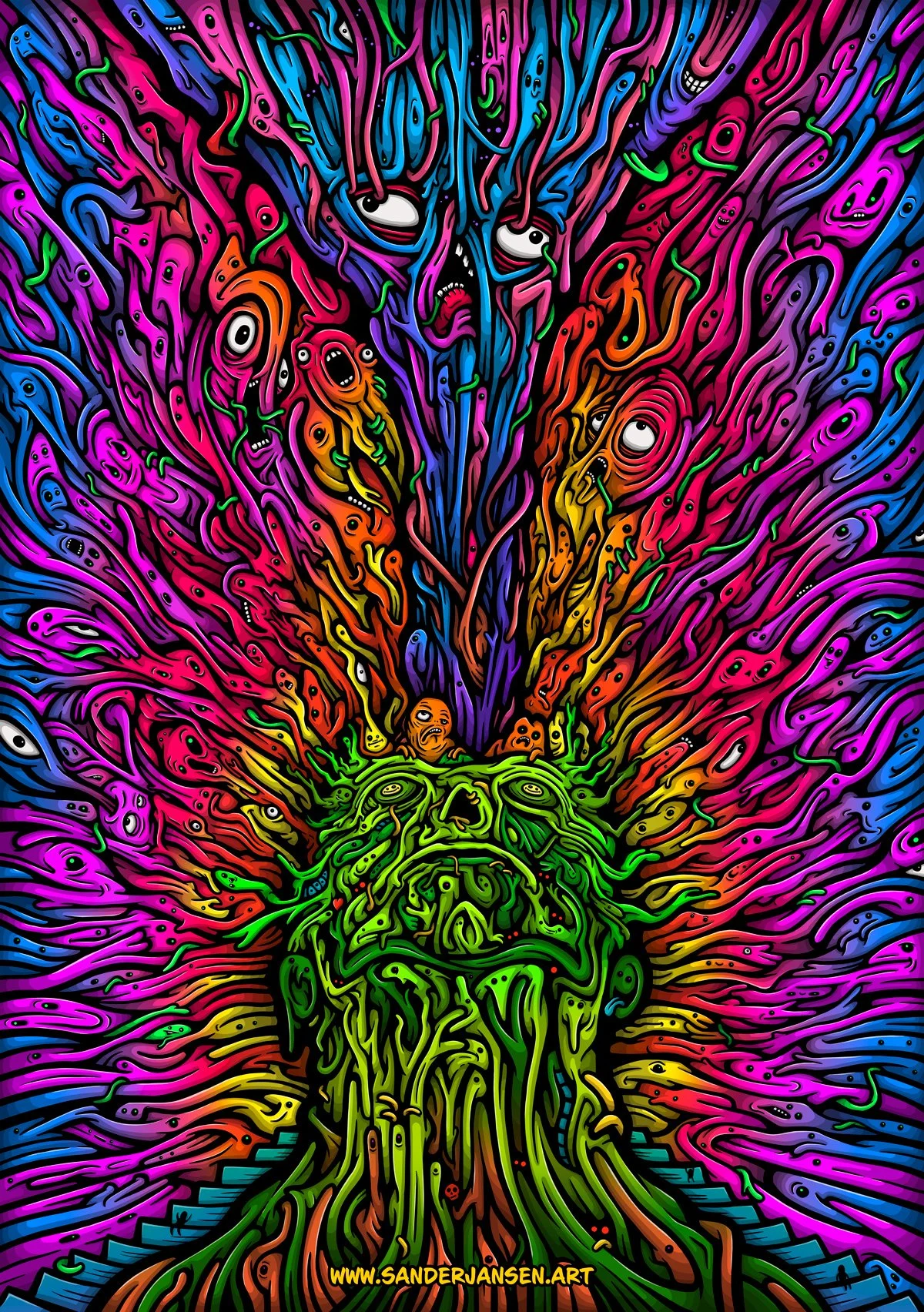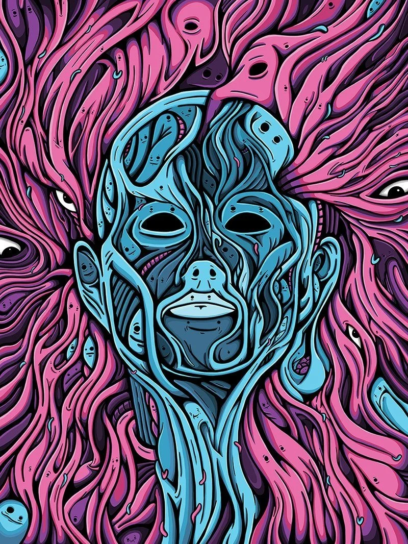 Since then, he has developed a distinctive style that blends intricate linework, detailed compositions, and vibrant colors. His creative process often starts with automatic drawing, allowing subconscious ideas to shape surreal and psychedelic imagery.